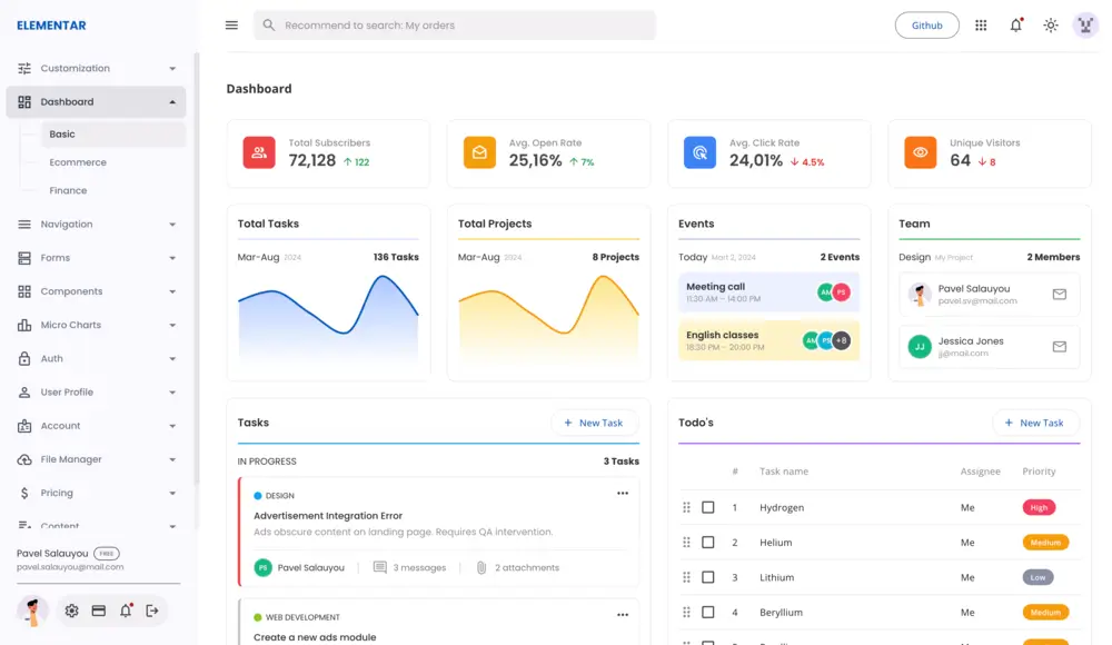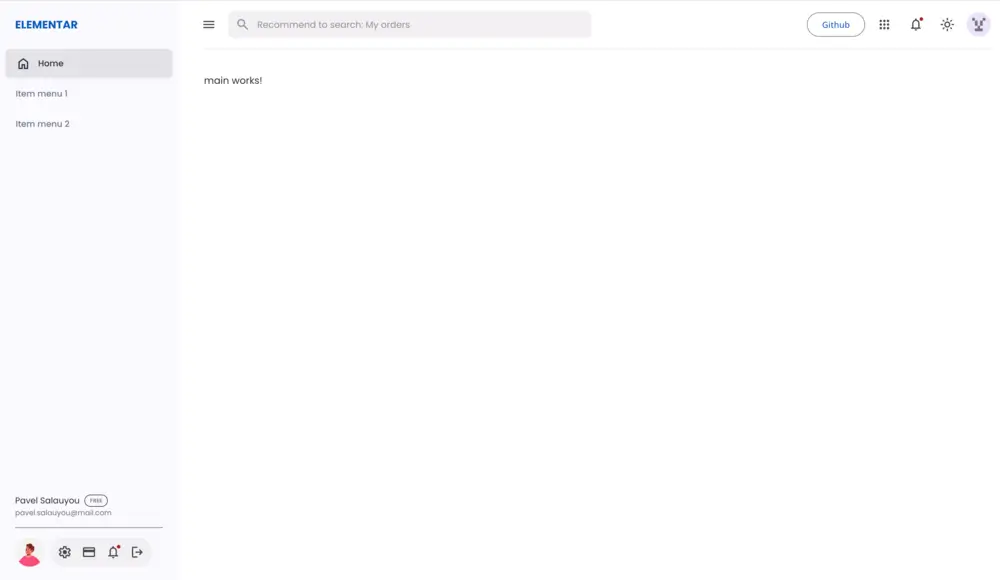 Elementar Admin consists of building blocks that can be used to create different application layouts. The idea is to make these blocks based on Angular Material components and then apply them to different types of applications.
