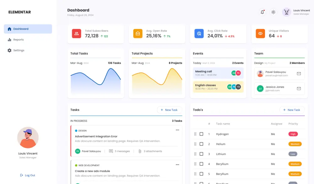 Elementar - Angular Material Admin Dashboard Template is easily customizable, developer-friendly codes, fully responsive design, SASS & Tailwind support and many more features to quick start with any project.
